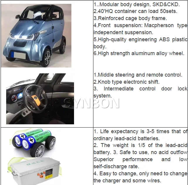 SYNBON electric car is fashionable, advanced technology, excellent craftsmanship and performance, safe and comfortable, energy-saving and economical. It is an excellent product.This model electric vehicles is a 3 person capacity and high-level luxury electric vehicles.